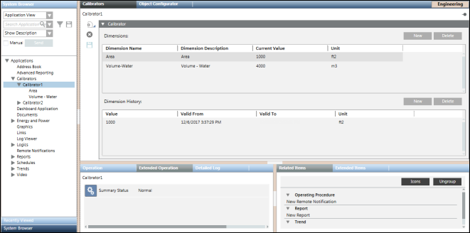 These calibrator objects or dimensions can be linked to aggregator nodes in views. The historical dimension values are used to calculate energy performance in energy reports.