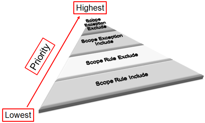 The Scopes application works by assigning a priority level for each condition in a Scope Rule or Scope Exception.
