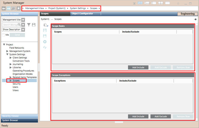 Add Include | Adds a Scope Exception Include row. In one row you can add only one node (system object) from the System Browser. If you select multiple objects and drag-and-drop them to the Scope Exception Include row, only the top most selected object will be added. |