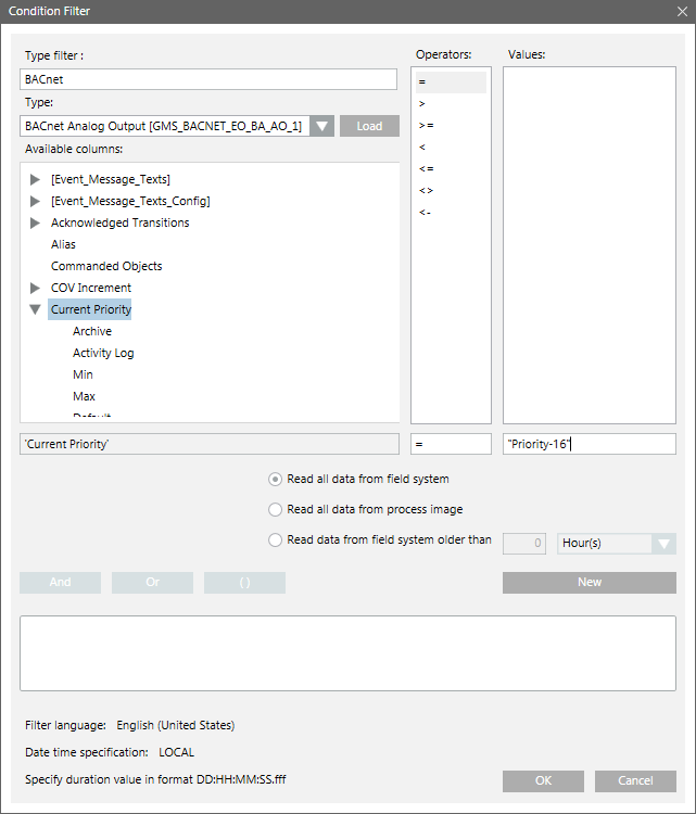 The Condition filter also allows you to create complex filters and conditions using mathematical and logical operators, and wildcard characters. The following operators are supported: