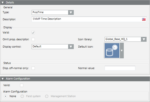 - In the Alarm Configuration expander, check that the alarm configuration is disabled (the corresponding Valid option must be unselected).