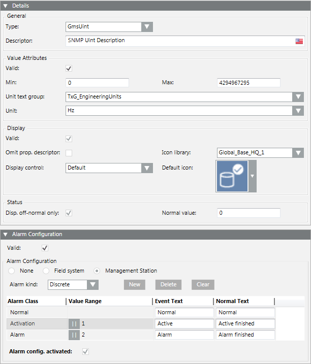 • Activate the Value Attributes configuration. Verify that Min/Max values match the variable size (see SNMP Data Types Relationship) required by the SNMP point (for example, Min/Max values go from 0 to 4294967295 (default)). Select the Unit text group to use and the corresponding Unit (for example, TxG_EngineeringUnits as text group and Hz as measurement unit).