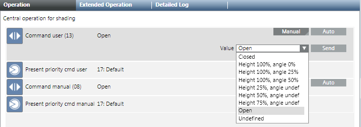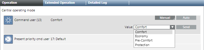 - Select Applications > Logics > Central Functions > [Network name], property User command (13) [Category] > [Central Operating Mode (CenOpMod)].