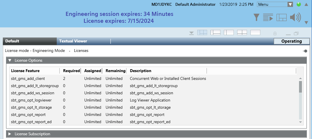 You can double-click the blue Engineering Session text in the Summary bar to display all the details of the Engineering Mode license. The Assigned and Required columns will show Unlimited for the license features.