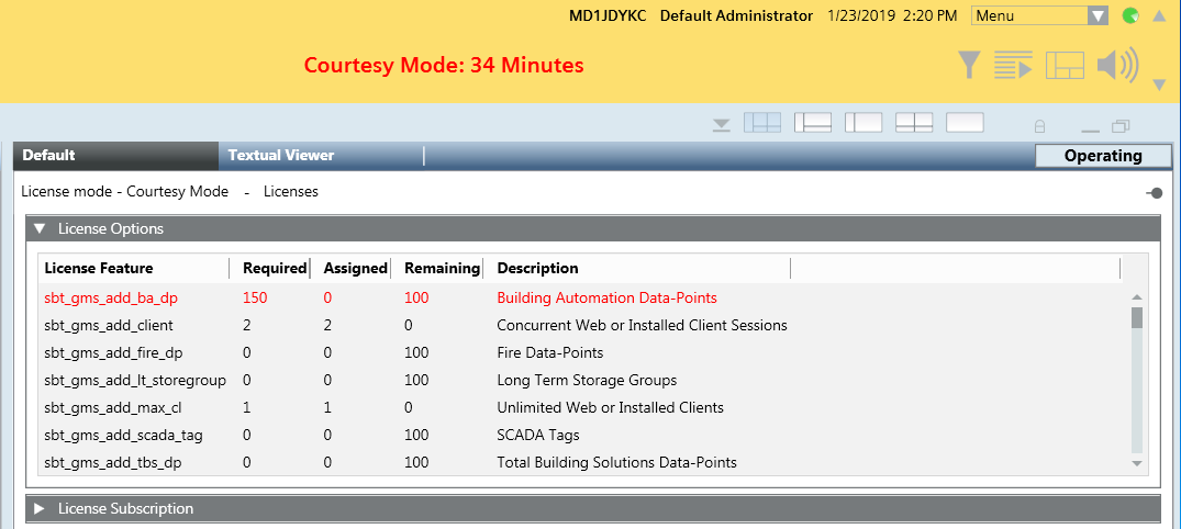 - An insufficient set of license features for field points is detected. That is, the site project was configured with a certain number of physical objects, but only a subset of these are licensed. For example, if the site project was configured with 2000 building automation data points but only 1000 are licensed, Courtesy Mode activates.
