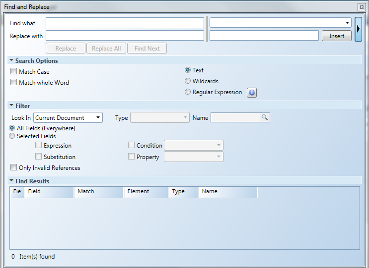 • Insert: Insert the Property and Value information into either the Find what or Replace with field, depending on where the cursor was active.