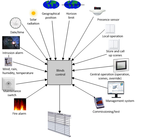 Control requires a variety of information on environmental influences and user interventions to meet requirements. The following illustration provides an overview of influences that may need to be considered to control blinds.