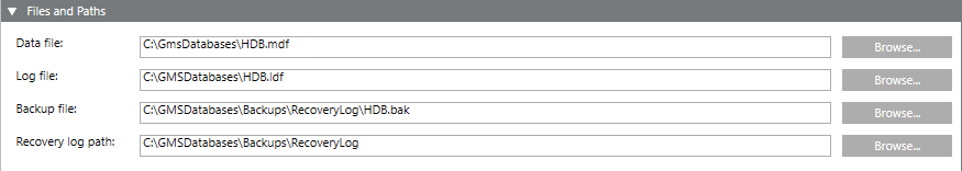 Log files | The destination where the log files (.ldf) are saved. |