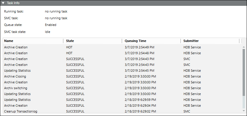 The Task Info expander displays pending tasks or tasks to be executed by the Siemens GMS HDB Service. It also displays information on the tasks that have been previously executed by the Siemens GMS HDB Service along with the execution status. This information is online and is not stored.