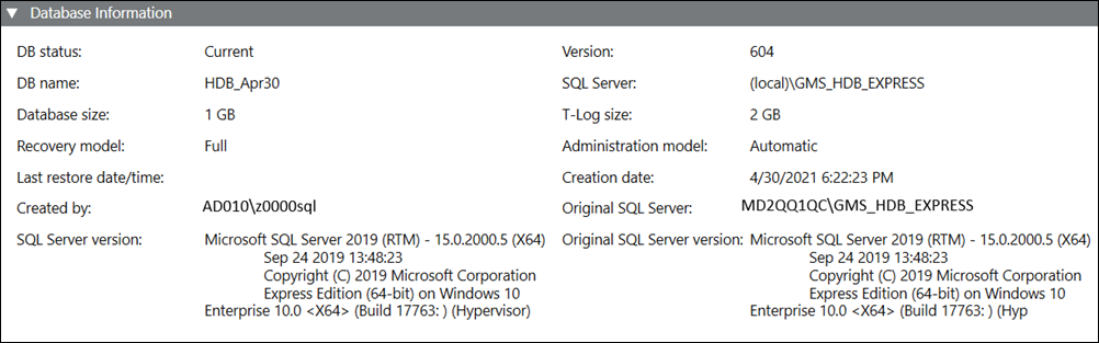 Original SQL Server version | Displays the original version of the SQL Server used to create the History Database. |