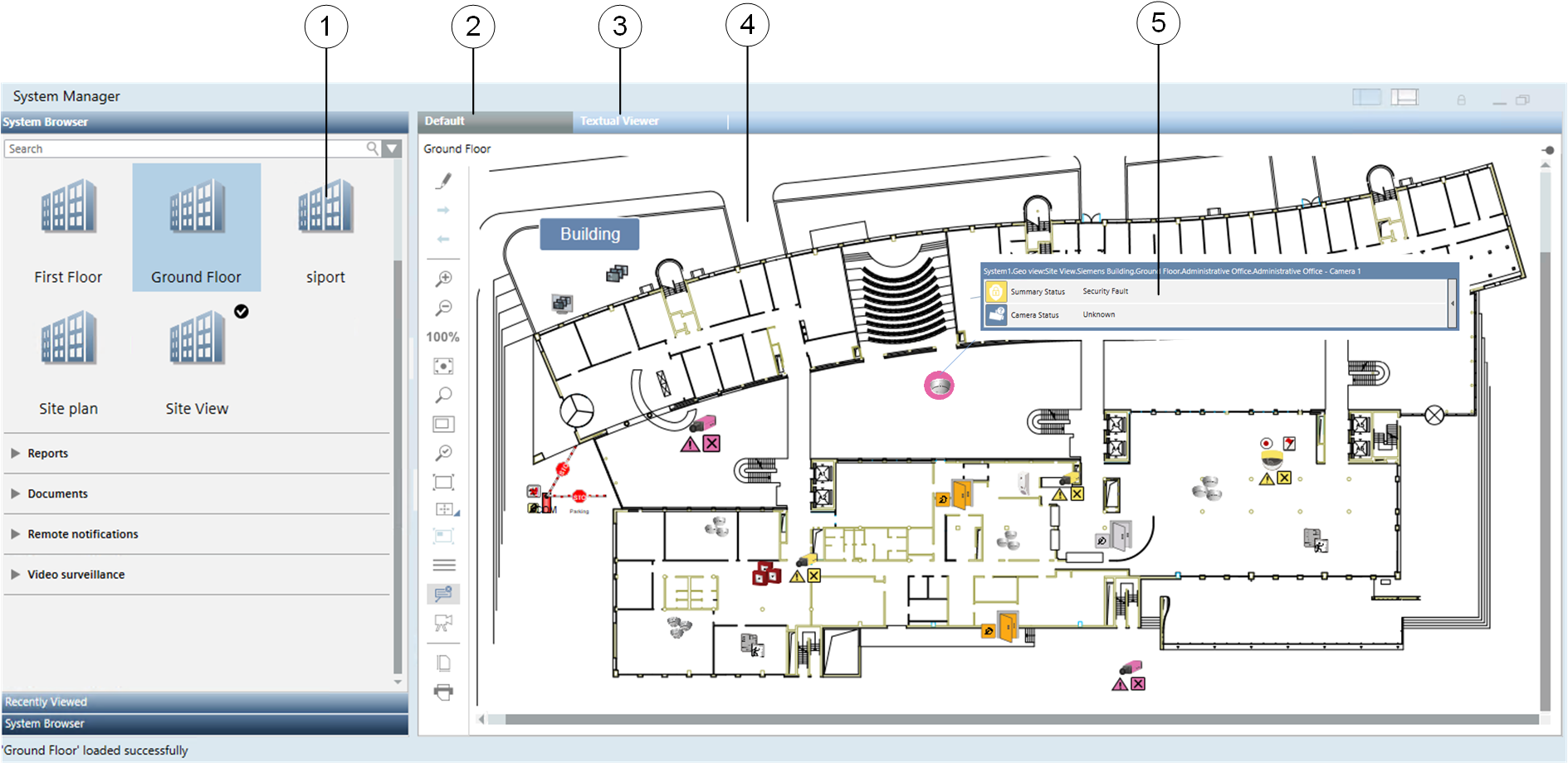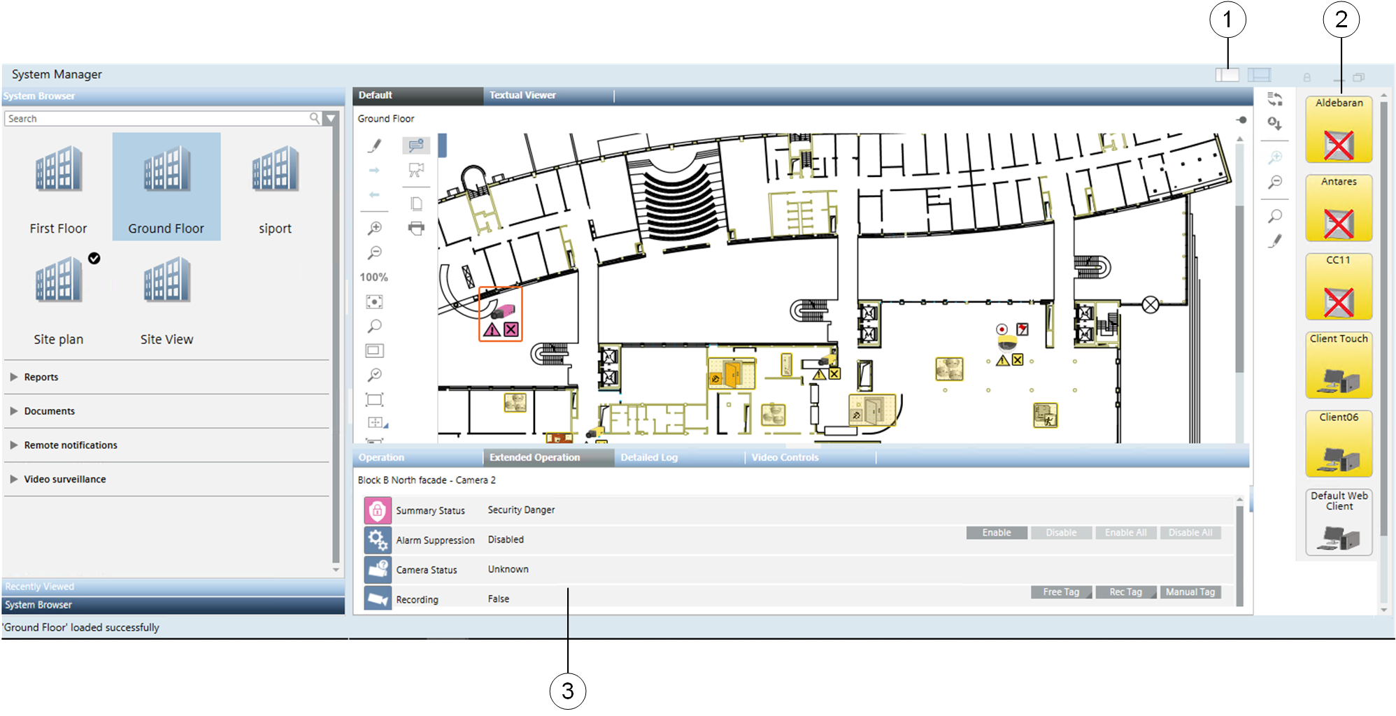 System Manager is a multi-pane window for navigating, monitoring, and controlling all the components and subsystems of your site. For example, you can inspect properties and states of objects, consult floor plan graphics, send commands, and so on. In the Lite DMS User Interface, two System Manager layouts are available, a primary and an advanced layout, and you can easily switch between the two.