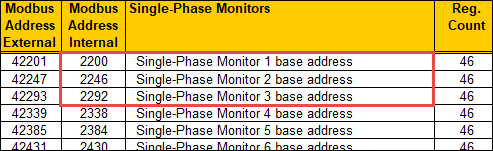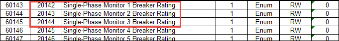 - If you want to configure the offset for the CT rating for each of the EMMM, then you need to mention the internal address for each EMMM as the Offset value for the value.info.meter_CT_rating property for each EMMM in the CSV file. For example, if you want to configure the CT rating for 3 EMMMs (Single-Phase Monitor 1, SEM3 Single-Phase Monitor 2, and SEM3 Single-Phase Monitor 3), then you will have to mention the internal address of the EMMM from the device manual (20142, 20143, 2144) as offset values for the value.info.meter_CT_rating property in the CSV file.