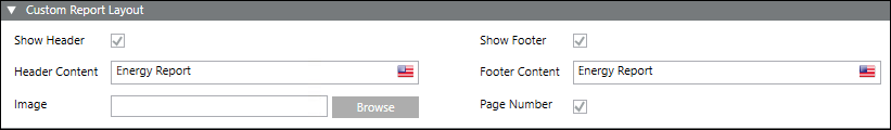 Deselecting the Show Footer check box disables the Page Number configuration. - Header Content: (Default selection) Enter the text to be displayed in the report header.