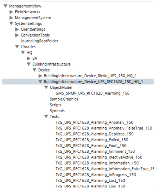 The UPS RFC1628 extension installs the Desigo CC library BuildingInfrastructure_Device_UPS_RFC1628_150_HQ_1 that is available at the following path: Libraries > L1-Headquarter > Building Infrastructure > Device.