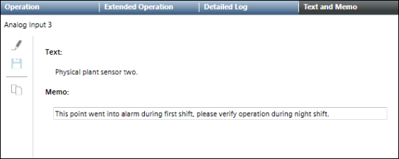 Memos are modified in the Text and Memo tab, available in the Contextual pane. Memos are useful for conveying instructions or additional information about objects important to a management station operator. For example, a memo can include notes about an object being out of service, scheduled maintenance, or parts that were ordered.
