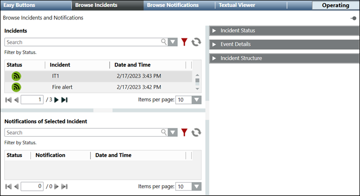 The Browse Incidents tab displays in Operating mode when you select Applications > Notification in the Application View from the System Browser.