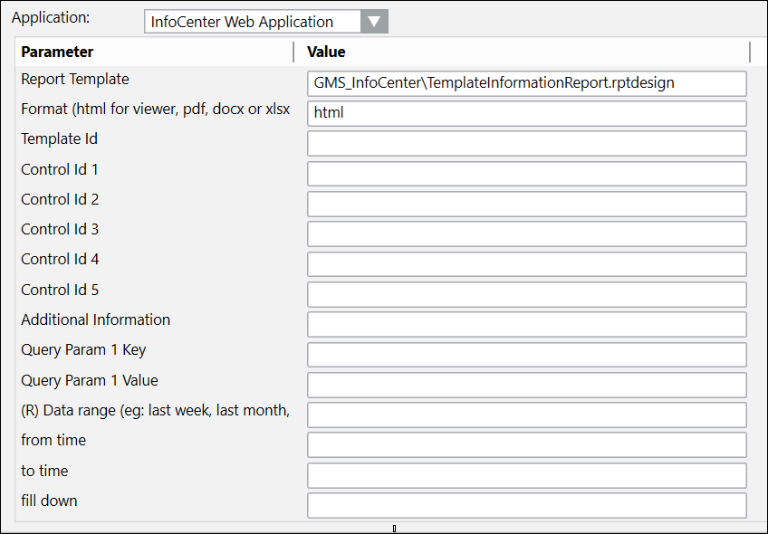 This custom report is run when you want to create a new web rule and need the required parameters to do so. The Template Information Report can display the parameters for all existing templates on the connected InfoCenter server, or, if a specific report name is entered, only the parameters related to that report.