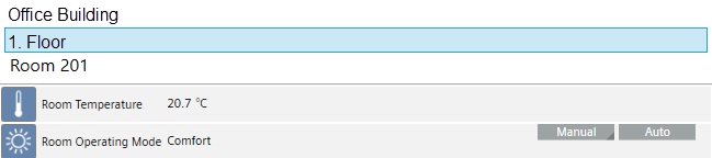 | Displays the floor listed for navigation in Desigo CC that is generated from the BIM data. A corresponding color code is displayed when using room grouping. NOTE: The displayed floor names can differ from the system data. |