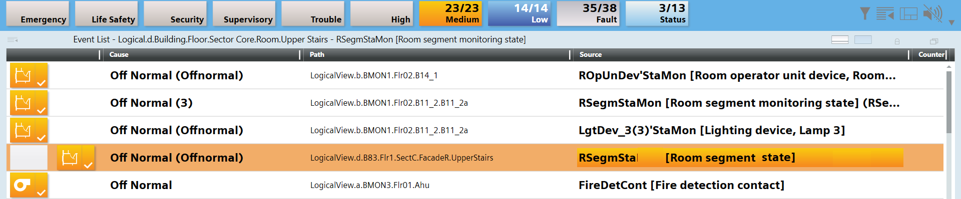 - The Common Event view is displayed. All the alarms in this segment are displayed. NOTE: There are situations, however, where the Common Event view cannot be opened directly. In this case, you must select the object [RSegmSta] Room segment status.