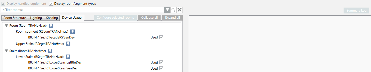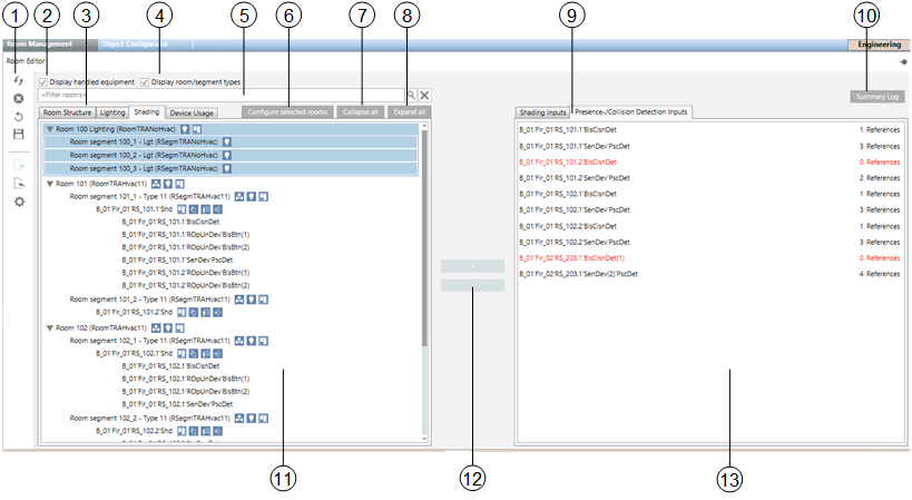 11 | Room information list Displays all rooms taken over in the room information list by the System Browser. To improve the overview, drag only the rooms for editing to this window. Individual devices can enabled or set to out of order in the Device Usage tab as the situation in the room changes. | ||