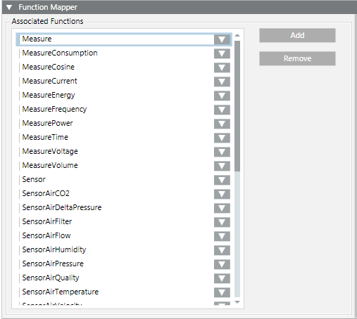 In the Models & Functions tab, the Function Mapper allows you to define which functions are associated with a particular object model. For example, you might have object models for three different devices, as represented in the figure, that must all be mapped to the 'temperature sensor' function. Doing so allows the varying properties defined in each object model to be mapped to consistent properties defined within the function. For background information see Function Mapper Expander.