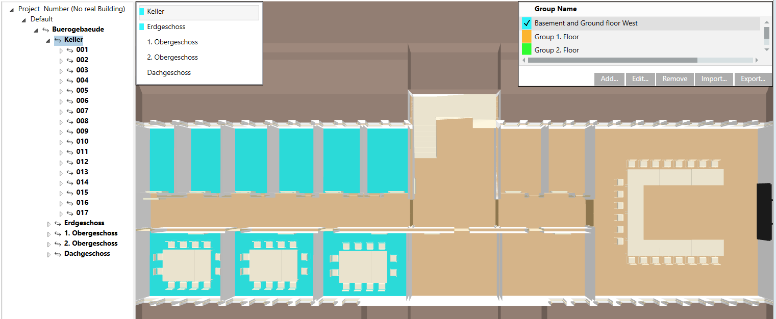 The Room group function merges individual rooms into a group. The groups can be derived from existing connections (for example an air handling unit) specific to the application or can form a purely static group.
