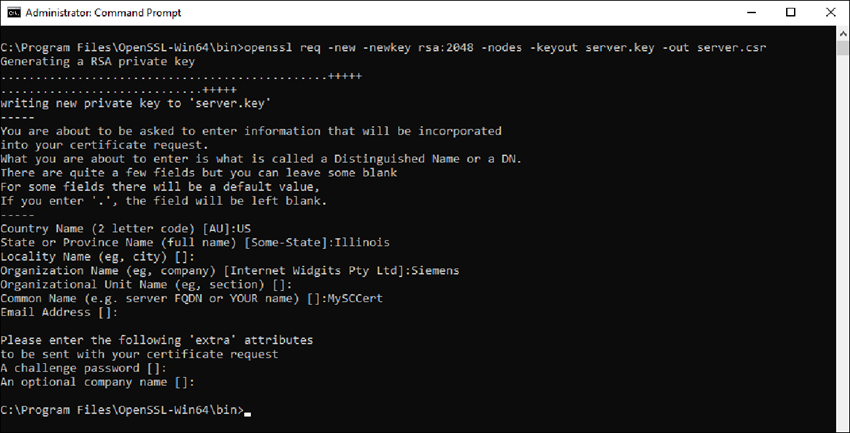 When prompted, complete the fields for your certificate. Do not enter a challenge password. Provide a Common Name such as MyBACnetSCCert.