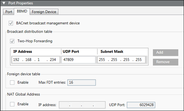 NAT Global Address | Allows you to enable the BBMD for Network Address Translation (NAT) compatibility. Once enabled, you can add the IP address and UDP port for NAT support. |