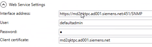 In the Web Service Settings expander of the SNMP Configurator tool, connect to the web service interface as follows: a. In the Interface address field, paste the URL previously copied. b. Enter user name and password to configure the user credentials for the Desigo CC SNMP service to access the NORIS interface. c. Click Browse, select the host certificate, and then click OK. d. Click Connect. NOTE: At any subsequent connection, you will be required the password only.