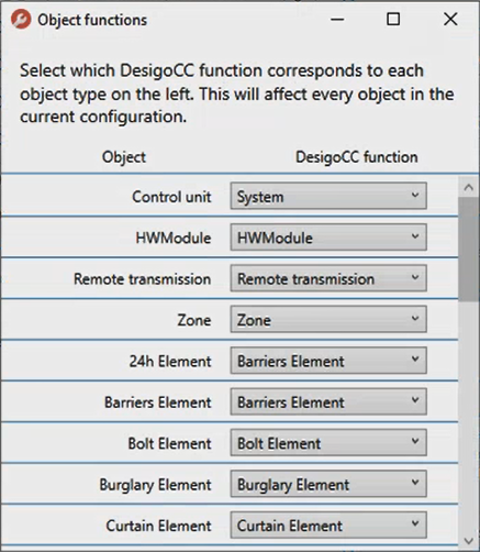 . - In the Object functions dialog box, next to each object, select a function different from the default setting.