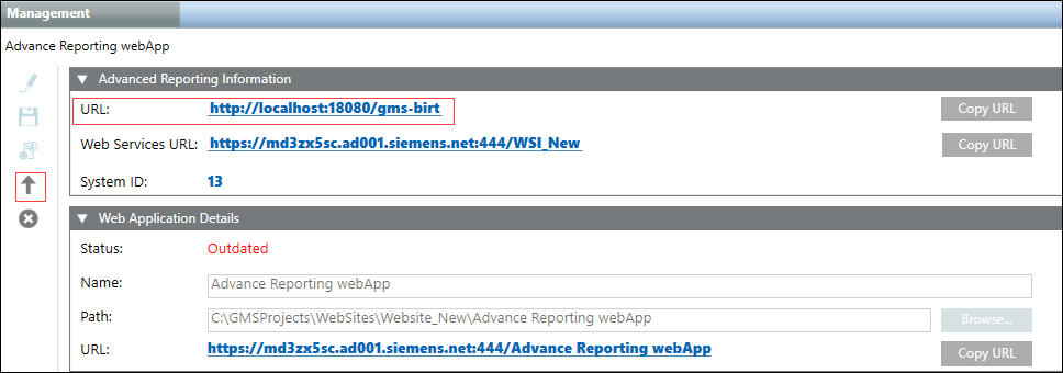 - The selected Advanced Reporting web application is upgraded. If you are upgrading the Advanced Reporting web application to V7. 0 from any version, Tomcat URL changes to http://127.0.0.1:18080/gms-birt.