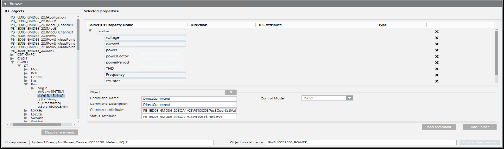 - The information of the IEC61850 device objects and their associated properties displays in a tree structure in the IEC objects list. The Selected properties section refreshes and displays the folder structure for the grouping of related properties of the object model and other columns such as Property Name, Direction, IEC Attribute, and Type.