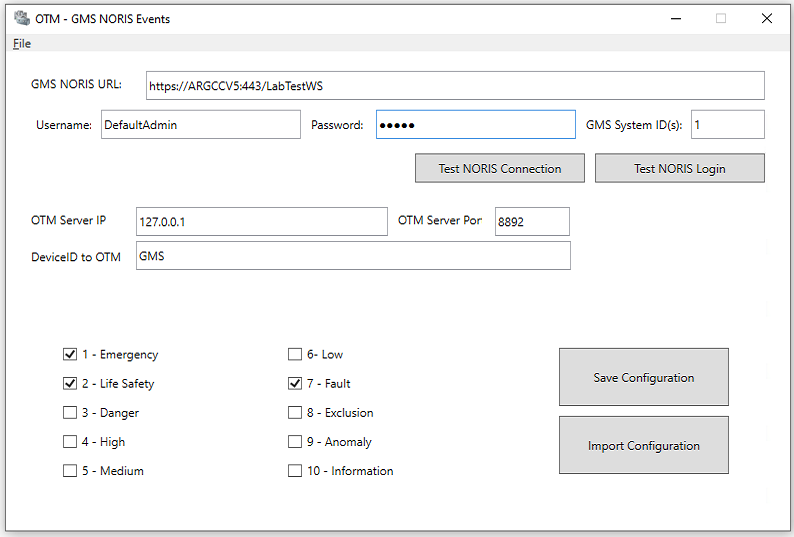 In Username and Password, enter the credentials of a Desigo CC user that has scope visibility on the events to transmit, and on the OTM System object (see OTM Events). NOTE: Use the pushbuttons to Test NORIS Connection and Test NORIS Login. To run a test, click the button, and a success or failure response appears on the button itself.