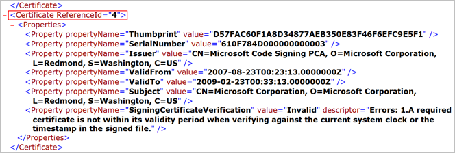 If the SigningCertificateVerfification is invalid, the value (reason) is displayed.