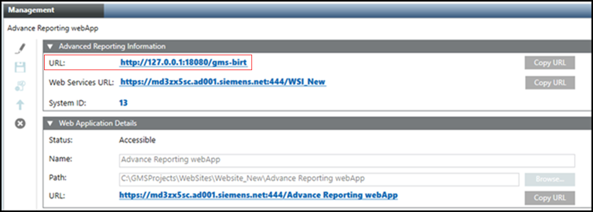- A read-only URL for Tomcat Server http://127.0.0.1:18080/gms-birt displays in the Advanced Reporting Information expander. 5,