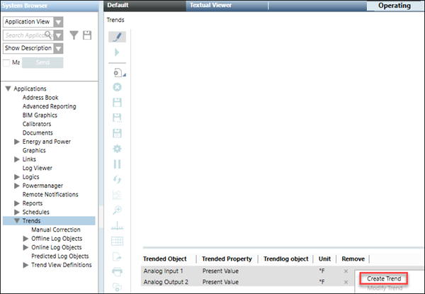 2. BACnet points to be added to the trend log objects display in the Trend Viewer and the Trend Viewer is in Edit mode. For more information, see Add BACnet points to the Trend Viewer.