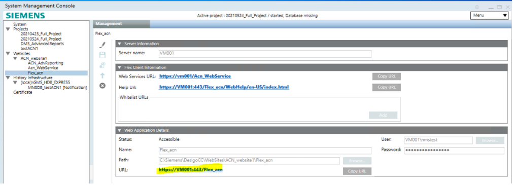This can be the same website under which you created the web service, or a different one. The URL of the website will determine the URL of the Flex Client application that users must enter in their browsers (highlighted in yellow in the image below). - Click