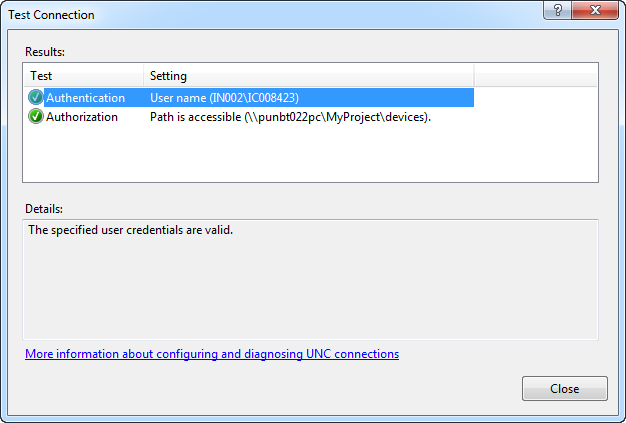 The specified user credentials are validdisplays in the Details section.