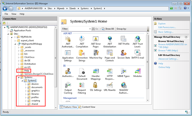 - The documents, graphics, libraries, profiles, and shared virtual directories are created under the Systems\[System Name] node in IIS on the target machine.