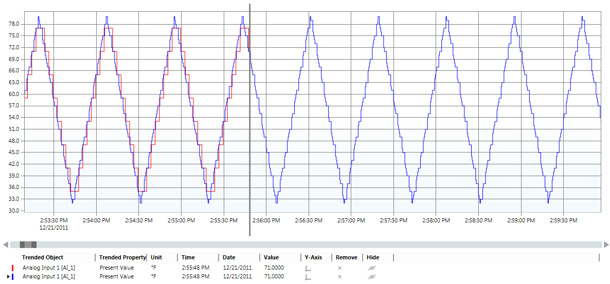 The offline trend data from the trend log objects or trend log multiple objects is uploaded to the management station. The red curve indicates the updated Offline Trend data. The blue curve indicates the online trend data.