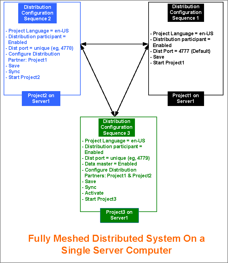 You want to set up a Fully Meshed Distributed System on a single server (Segmented Configuration). To do this, you must configure the projects in distribution on the same Server.