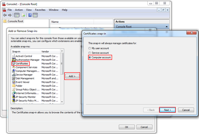 In the Certificates snap-in dialog box that displays, select the option Computer account and click Next, and then Finish.