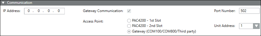 - Gateway Communication: By default, this check box is selected, setting the Access Point to the Gateway (COM100/COM800/ThirdParty).