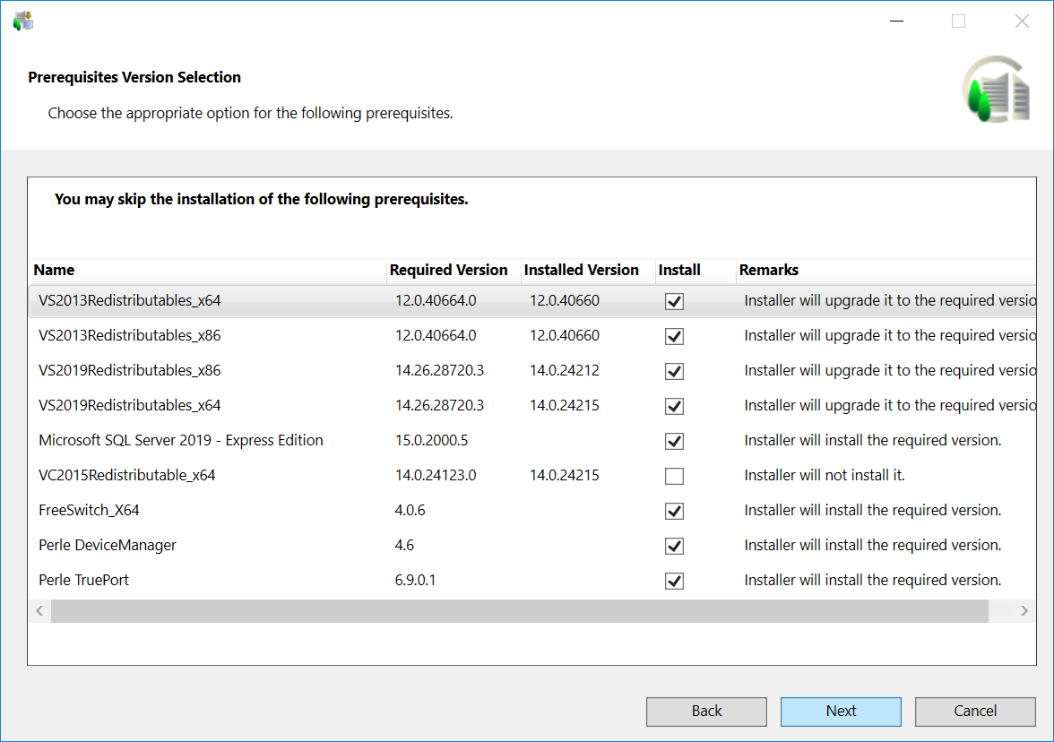 By default, all the previously installed prerequisites are upgraded by default, if they are available in the distribution media. At the same time the prerequisites, listed in the <SkipInstallation> section are skipped. NOTE: The prerequisite, listed in the <SkipInstallation> section, for example Microsoft SQL Server 2022 - Express Edition, is skipped only when the value AskUser = 1 and Mandatory = 0 is configured in the GMS/EMConfig.xml file. The Prerequisite Version Selection dialog box only displays when there is any conflict with the installed prerequisites and the <AutoResolvePrerequisiteConflict> is set to False in the GMS Platform.xml file. It lists the required versions of the installed prerequisites and recommends you to install the required version, if the installed version is not compatible. If you have already installed V4.2 with Microsoft SQL Server 2014 - Express Edition, you do not need to uninstall it. During upgrade Installer upgrades it to the latest version, Microsoft SQL Server 2022 - Express Edition. However, in V4.2 if you have skipped the Microsoft SQL Server 2014 - Express Edition installation during installation or used your own SQL Server, still in V4.2 required SQL Client components prerequisites are installed. Now, during upgrade, Installer upgrades to required Microsoft SQL Server 2022 - Express Edition and installs/upgrades required SQL Client components prerequisites. You can also skip Microsoft SQL Server 2022 - Express Edition. Note that the required SQL Client components prerequisites are still upgraded/installed.