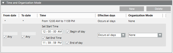 The Time and Organization Mode expander lets you specify one or more time-dependent conditions (date ranges, time intervals, days of the week, and so on) for triggering the incident template you are configuring.