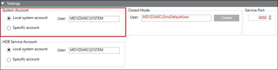 - Specific Account: Using the Specific Account option, you can change the default value (user). If you change the default, you must provide the valid password and confirm it. Changing the default (SYSTEM) internally changes the projects Pmon user and history database’s HDB user. This displays in red when you select the project and HDB. You must edit the project and HDB, which internally syncs the Pmon user and HDB user. The GMS_WCCILpmon_[Project Name] service gets configured in Windows to start under this specific account. The changed user is set as the HDB user.