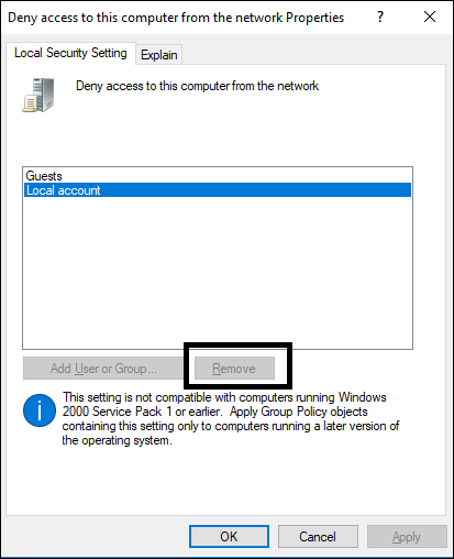 For this you must remove the web site user (local windows user) from Deny access to this computer from the network. In case you don’t have rights to remove local account as shown in the image, do the following steps to remove the required account (for example, Local account):