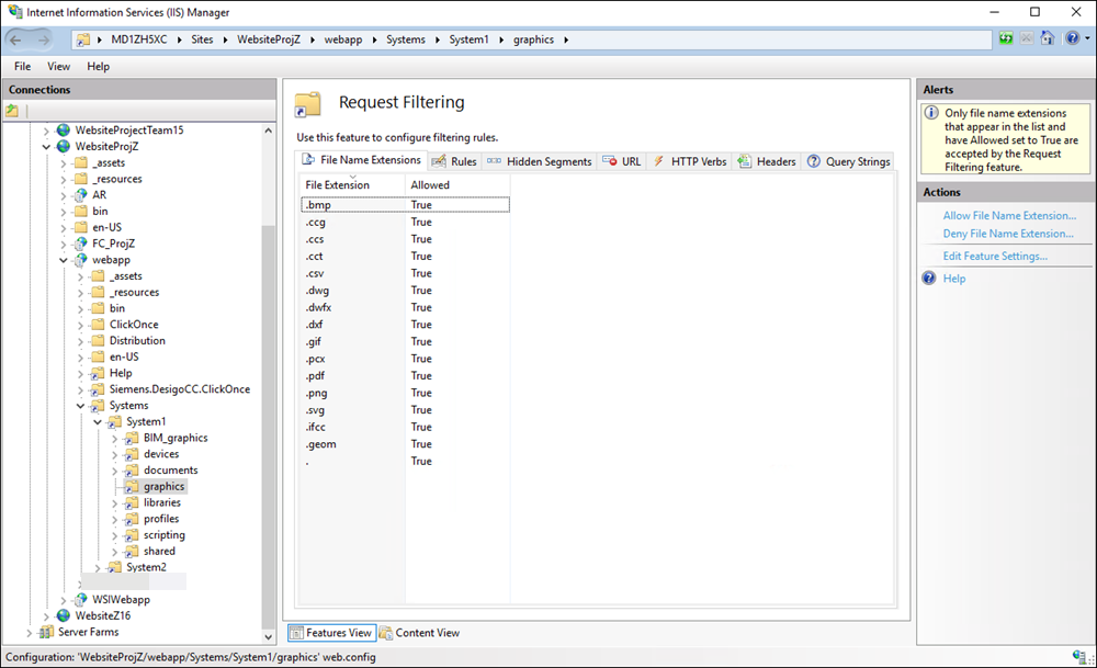The allowed file types for each virtual directory mentioned in the web.config file are also configured in IIS using the Request Filtering feature, thus ensuring file transfer only for the specified file types. Note that no request filtering is configured for the shared and documents virtual directories as these are read-only directories. To view the allowed file types for a virtual directory in IIS, do the following: