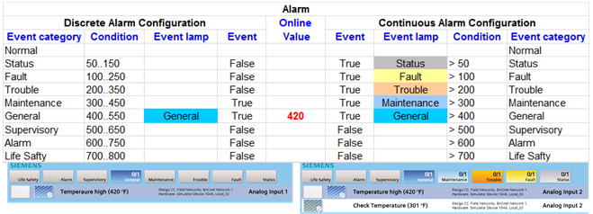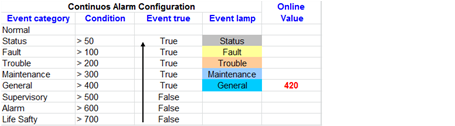 Multiple alarm states can be displayed as active for continuous alarm configuration. Processing is always through the entire alarm configuration for a continuous alarm. When multiple conditions are valid for the same event category, they are also displayed in the event lamp counter.