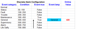 Only one alarm state is displayed as active in a discrete alarm configuration. Processing for a discrete alarm occurs based on the alarm configuration from bottom to top. The first event category to meet this condition is displayed (no additional checks for other correct conditions).